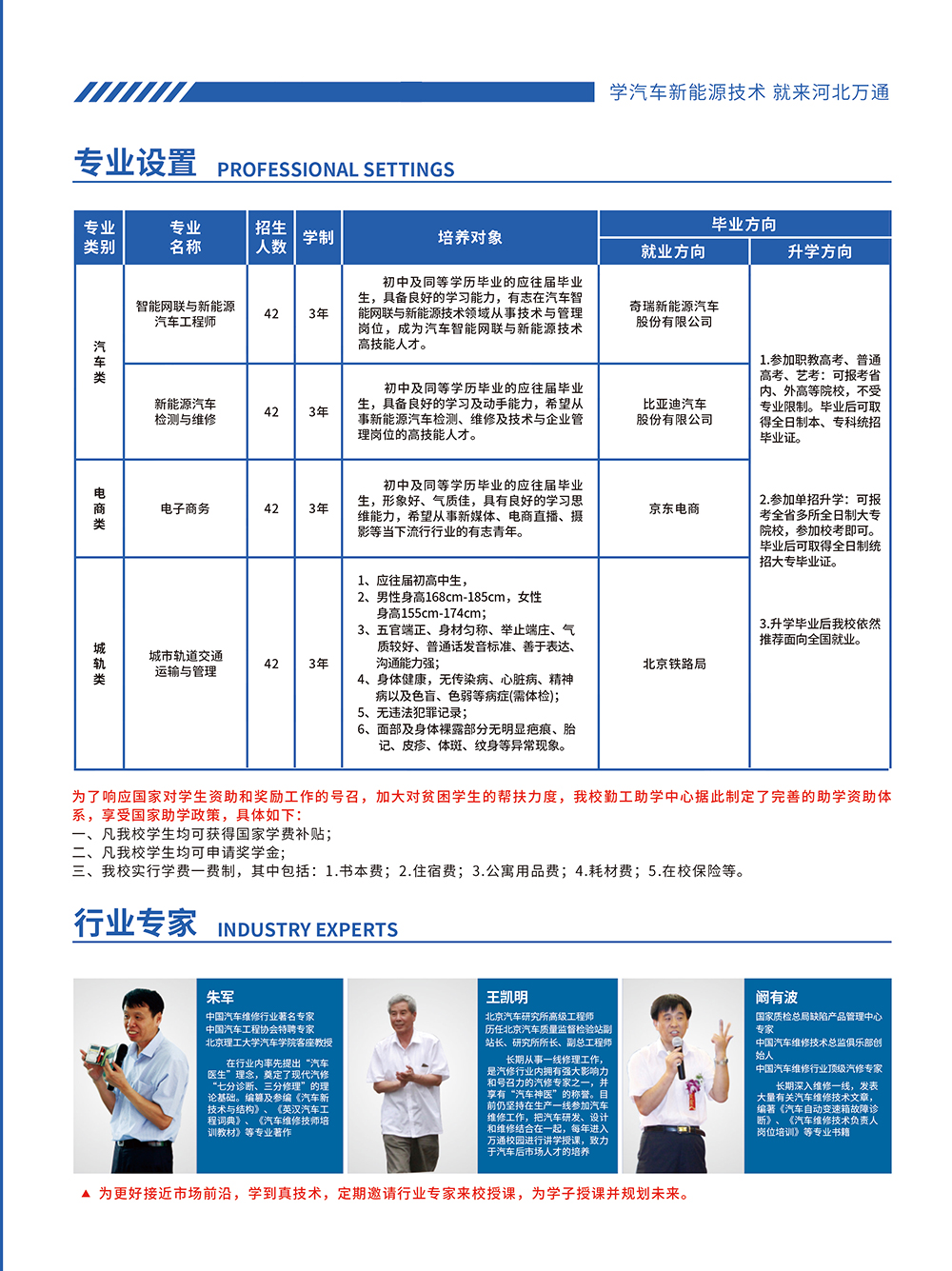 河北万通技工学校2025招生专业:智能网联与新能源汽车工程师、新能源汽车检测与维修、汽车技术应用与维修、电子商务专业、城市轨道交通运输与管理专业等。
