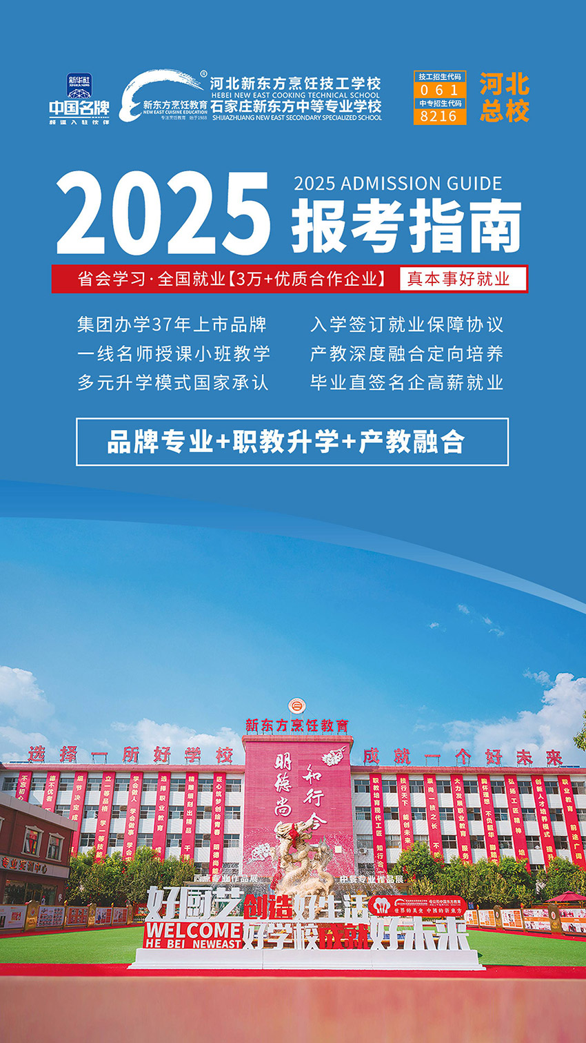 河北新东方烹饪技工学校(石家庄新东方中等专业学校)是由上级行政主管部门批准设立的一所职业技能全日制学校,是职业技能鉴定所认定的具备厨师培训资格的职业学校,和数千家宾馆、酒店合作委培的大型烹饪人才培训学校,隶属于新华教育集团。校园环境优美,学术氛围浓厚,教学设施先进,师资力量雄厚,拥有国内高水准的多功能形体教室、宽敞明亮的理论教学厅、多功能实习大厅、标准化演示大厅等教学场所,是学习厨师、西点、西餐、特色小吃的理想学校。